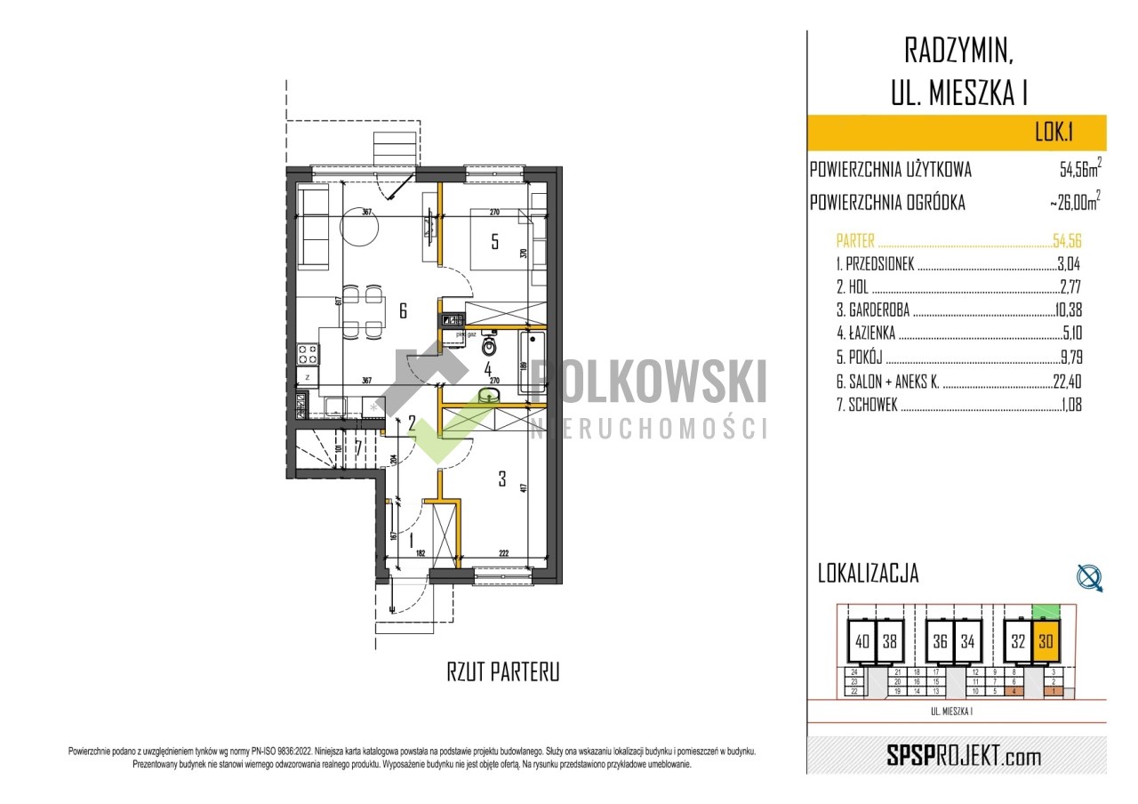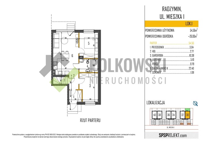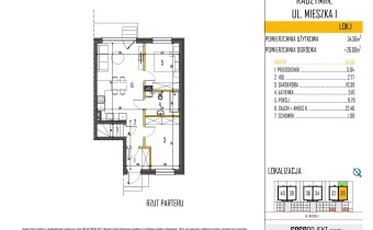 Lokal na parterze składa się z dwóch sypialni (10,38 m2 i 9,79 m2 ) salonu z aneksem kuchennym (22,40 m2) holu (2,77 m2) łazienki (5,10 m2)