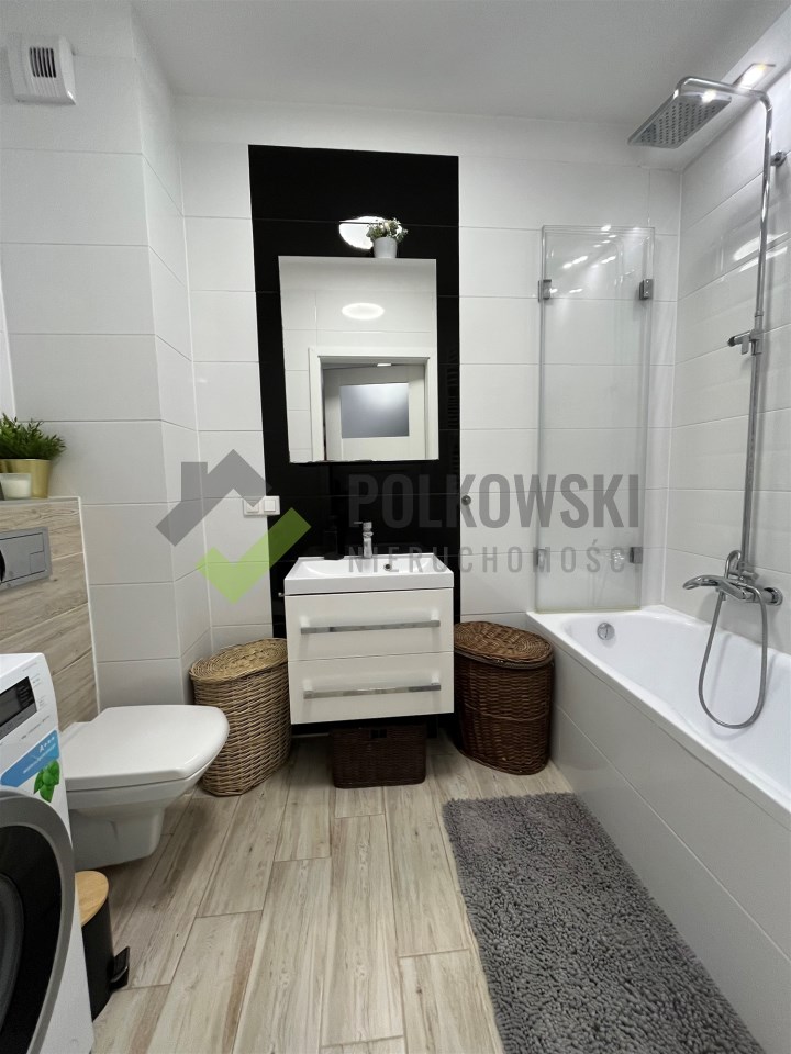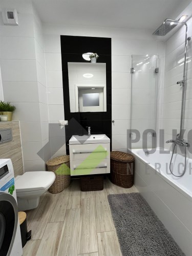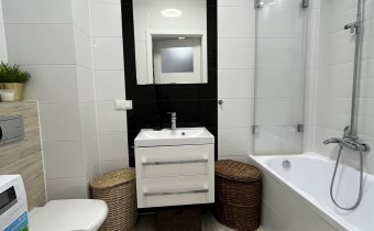 Wyposażona w wannę z szybą i funkcją natrysku, dzięki czemu można korzystać zarówno z kąpieli, jak i prysznica. W łazience znajduje się pralka oraz zabudowa meblowa do przechowywania.