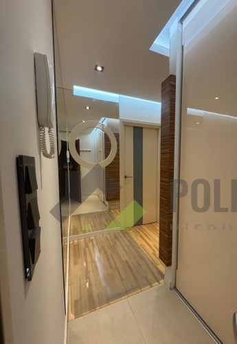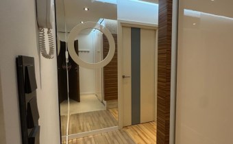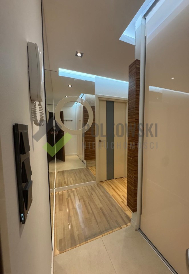 Przedpokój: Praktyczny i funkcjonalny. Ściana w trawertynie tworząca unikalny klimat holu, duże lustra plus wielowymiarowe oświetlenie -poczucie przestronności.